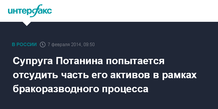 Москва. 7 февраля. INTERFAX.RU - Супруга владельца "Интерроса" и гендиректора "Норильского никеля" Владимира Потанина Наталья рассчитывает отсудить часть его активов в рамках бракоразводного процесса. Так следует из документа, опубликованного в пятницу "Коммерсантом".