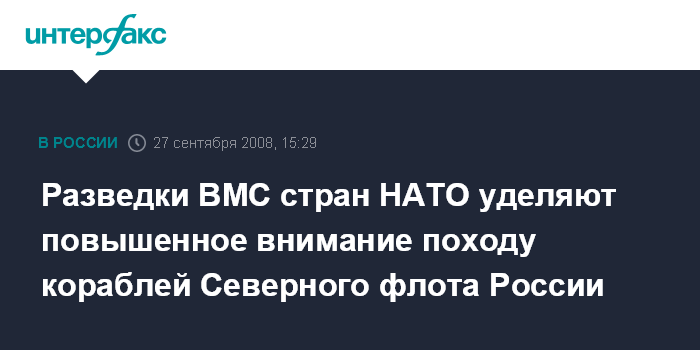 Москва. 27 сентября. INTERFAX.RU - Военно-морские силы стран Североатлантического альянса отслеживают поход боевых кораблей российского Северного флота, сообщил "Интерфаксу" в субботу помощник главкома ВМФ РФ Игорь Дыгало.