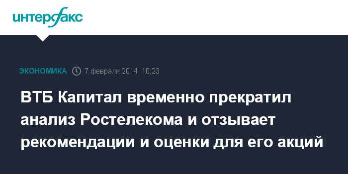 Москва. 7 февраля. INTERFAX.RU - "ВТБ Капитал" временно прекращает анализ ОАО "Ростелеком".