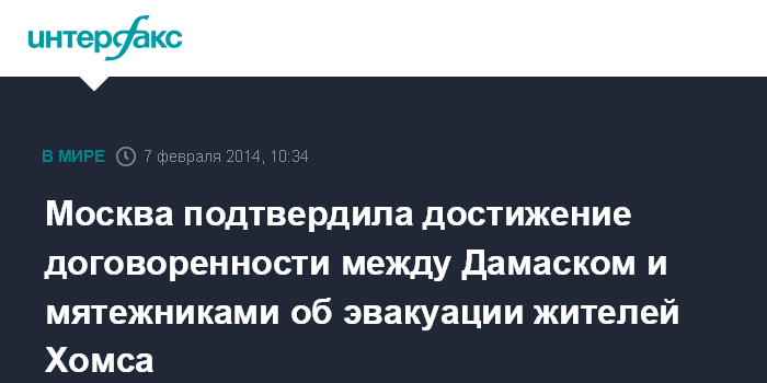 Москва. 7 февраля. INTERFAX.RU - Официальный представитель МИД РФ Александр Лукашевич подтвердил достижение договоренности между властями и оппозицией Сирии, которая блокирует старый город в Хомсе, в соответствии с которой оттуда будут выведены мирные граждане, а в сам город доставят гуманитарную помощь.