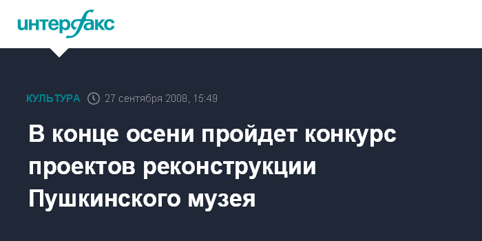 Москва. 27 сентября. INTERFAX.RU - В ноябре начнется конкурс проектов реконструкции Пушкинского музея, заявила на архитектурном биеннале в Венеции директор Пушкинского музея Ирина Антонова.