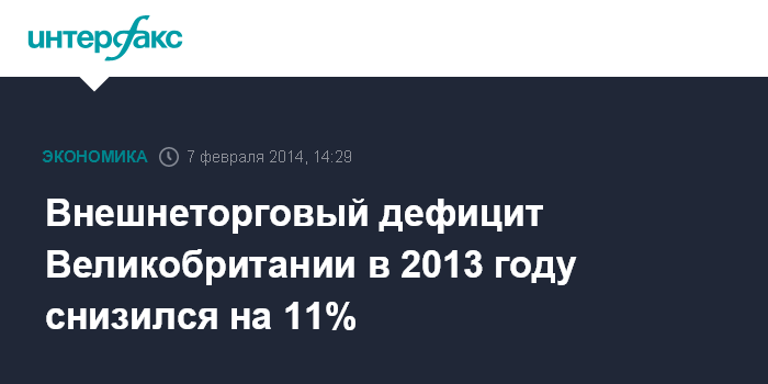 Экспорт товаров и услуг из Великобритании за 2013 год вырос на 1,4% - до 501,367 млрд фунтов. Импорт подрос на 0,8% и составил 531,220 млрд фунтов. Дефицит британской внешней торговли за прошлый год сократился на 11,3% и составил 29,853 млрд фунтов по сравнению с 33,640 млрд фунтов в 2012 году.