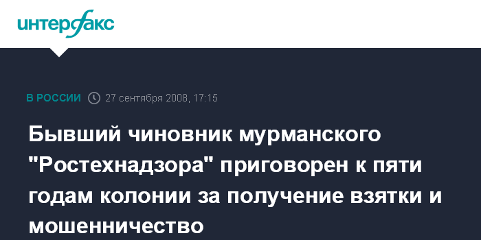Бывший чиновник мурманского "Ростехнадзора" приговорен к пяти годам колонии за получение взятки и мошенничество