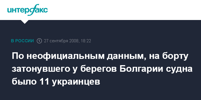 Москва. 27 сентября. INTERFAX.RU - По неофициальным данным, затонувший у берегов Болгарии сухогруз "Толстой" имел на борту команду из 12 человек: 11 украинцев и 1 россиянин.