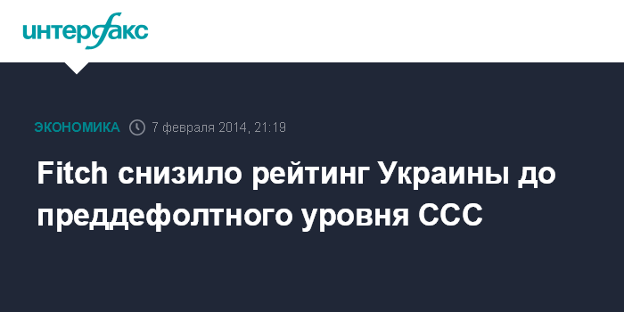 Москва. 7 февраля. INTERFAX.RU - Международное рейтинговое агентство Fitch Ratings в пятницу снизило долгосрочный рейтинг дефолта эмитента (РДЭ) Украины по обязательствам в иностранной валюте с B- до ССС, или "чрезвычайно спекулятивного" уровня.