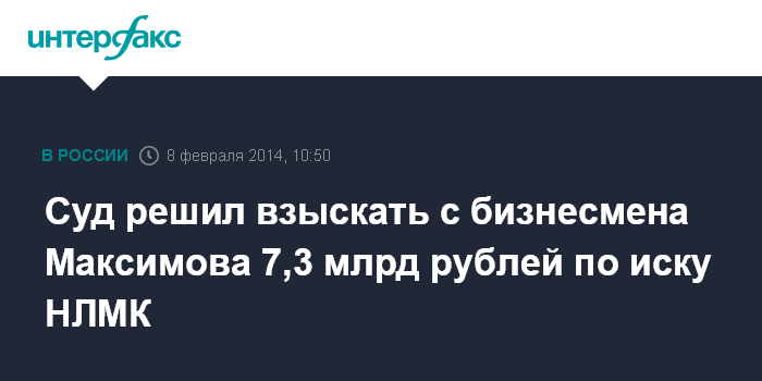 Москва. 8 февраля. INTERFAX.RU - Арбитражный суд Москвы в пятницу, 7 февраля удовлетворил иск ОАО "Новолипецкий металлургический комбинат" (НЛМК) и решил взыскать с бизнесмена Николая Максимова 7,3 млрд рублей.