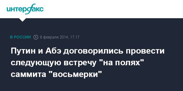 Москва. 8 февраля. INTERFAX.RU - Президент России Владимир Путин и премьер-министр Японии Синдзо Абэ договорились провести следующую встречу на полях саммита "восьмерки", который пройдет в Сочи 4-5 июня, сообщил после встречи двух лидеров пресс-секретарь главы российского государства Дмитрий Песков.