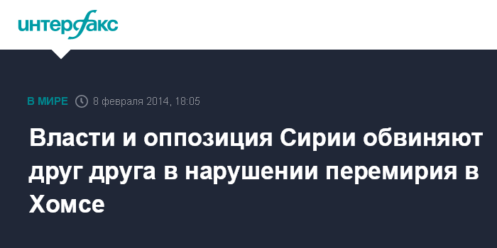 Москва. 8 февраля. INTERFAX.RU - Правительство и оппозиционеры в Сирии выдвинули друг против друга обвинения в нарушении трехдневного перемирия в сирийском городе Хомсе, сообщает британская телерадиокорпорация BBC.