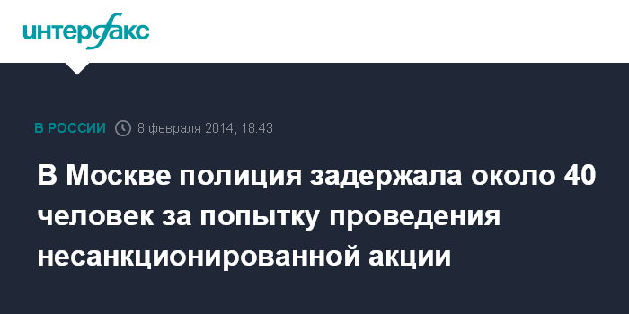 Москва. 8 февраля. INTERFAX.RU - Около 40 человек попали в отделы полиции за попытку проведения несанкционированной акции в центре столицы, сообщили "Интерфаксу" в пресс-службе ГУ МВД России по Москве.