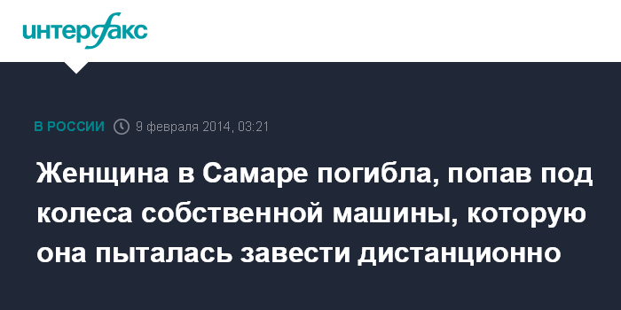 Москва. 9 февраля. INTERFAX.RU - Самарские полицейские проводят проверку по факту несчастного случая - гибели женщины от травм, полученных при наезде на нее автомобиля, заведенного пострадавшей дистанционно, сообщает в субботу пресс-служба ГУ МВД по Самарской области.