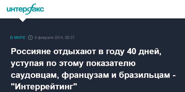 Россияне отдыхают в году 40 дней, уступая по этому показателю саудовцам, французам и бразильцам - "Интеррейтинг"