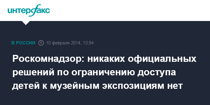 Москва. 10 февраля. INTERFAX.RU - В Роскомнадзоре заявляют, что никаких официальных решений по ограничению доступа детей к музейным экспозициям не принималось.