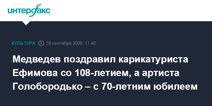 Москва. 28 сентября. INTERFAX.RU - Глава государства Дмитрий Медведев поздравил с днем рожденья знаменитого художника-карикатуриста Бориса Ефимова, которому в воскресенье исполняется 108 лет.