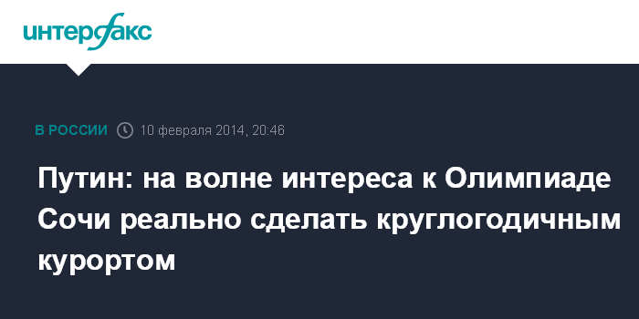 Сочи. 10 февраля. INTERFAX.RU - Президент России Владимир Путин считает нужным подумать, как превратить бум интереса к Сочи, вызванный Олимпийскими играми, в продолжительную тенденцию.