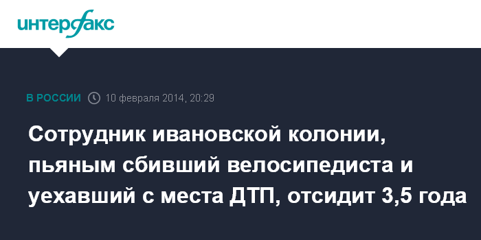 Иваново. 10 февраля. INTERFAX.RU - В Ивановской области вступил в законную силу приговор в отношении бывшего сотрудника исправительной колонии, осужденного к 3,5 годам лишения свободы за "пьяное" ДТП с погибшим.