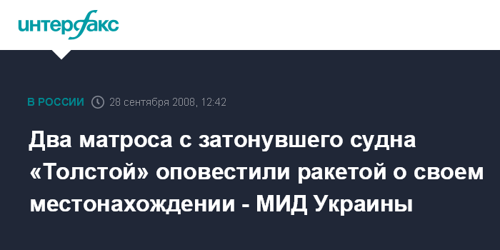 Киев. 28 сентября. INTERFAX.RU - Два члена экипажа судна "Толстой", затонувшего накануне вблизи территориальных вод Болгарии, оповестили сигнальной ракетой о своем местонахождении вблизи города Бургас (местность Царевец, Болгария), говорится в сообщении, размещенном на официальном сайте Министерства иностранных дел Украины в воскресенье.