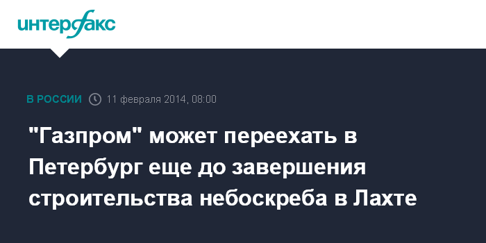 Москва. 11 февраля. INTERFAX.RU - "Газпром", чей переезд в Санкт-Петербург ожидался после окончания строительства небоскреба "Лахта центр", может перебазироваться в северную столицу еще раньше окончания его строительства, воспользовавшись арендованными офисами для временного размещения.