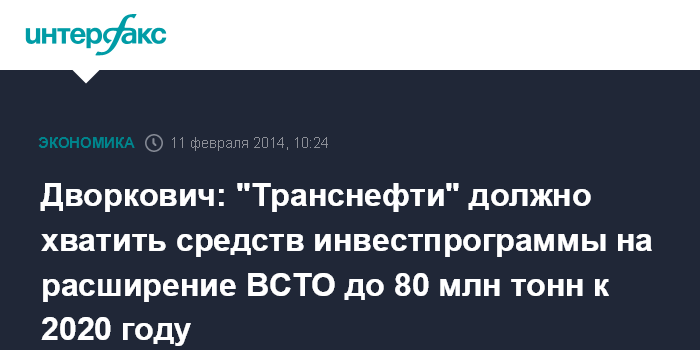 Москва. 11 февраля. INTERFAX.RU - "Транснефти" должно хватить средств инвестпрограммы для расширения нефтепроводной системы ВСТО до 80 млн тонн к 2020 году при умеренной индексации тарифов, заявил вице-премьер РФ Аркадий Дворкович на пресс-конференции в "Интерфаксе".