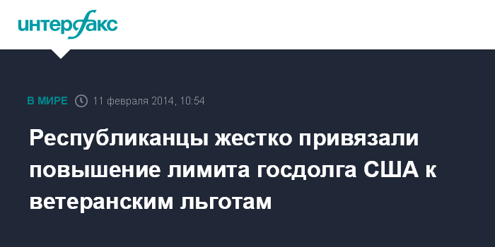 Москва. 11 февраля. INTERFAX.RU - Лидеры Республиканской партии в Конгрессе США готовы поддержать увеличение лимита госдолга страны лишь при условии частичной отмены сокращения выплат ветеранам боевых действий, пишет Wall Street Journal.