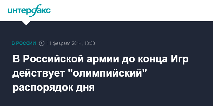 Москва. 11 февраля. INTERFAX.RU - Для военнослужащих Центрального военного округа до 23 февраля действует измененный распорядок дня. Официальный представитель ЦВО полковник Ярослав Рощупкин сообщил "Интерфаксу-АВН", что согласно новому распорядку военнослужащим выделено время для просмотра соревнований XXII зимних Олимпийских игр в Сочи