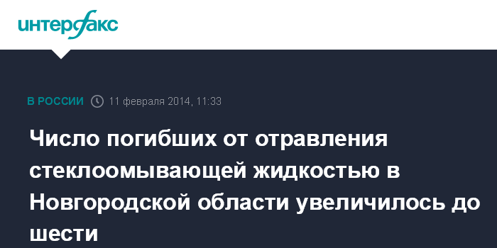 Москва. 11 февраля. INTERFAX.RU - Шесть человек скончались в Новгородской области в результате употребления стеклоомывающей жидкости, сообщили "Интерфаксу" в пресс-службе СУ СКР по региону во вторник.