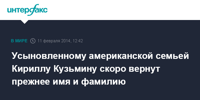 Москва. 11 февраля. INTERFAX.RU - Органы опеки на этой неделе ожидают возвращения усыновленному американской семьей Кириллу Кузьмину его первоначального имени и фамилии, сообщила журналистам во вторник начальник отдела опеки, попечительства главного управления социальной защиты населения Псковской области Валентина Чернова.