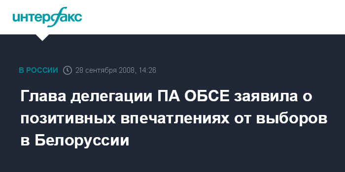 Минск. 28 сентября. INTERFAX.RU - Избирательная кампания в Белоруссии производит позитивное впечатление, заявила агентству "Интерфакс-Запад" в воскресенье в Минске глава делегации ПА ОБСЕ, координатор краткосрочных наблюдателей ОБСЕ на парламентских выборах в Белоруссии Анн-Мари Лизен.