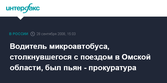 Омск. 28 сентября. INTERFAX.RU - Водитель микроавтобуса, столкнувшегося в воскресенье с поездом в Омской области, из-за чего более 20 железнодорожных вагонов упали в реку Иртыш, находился за рулем в нетрезвом состоянии, сообщает Западно-Сибирская транспортная прокуратура.