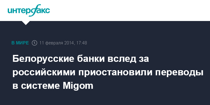 Минск. 11 февраля. INTERFAX.RU - Белорусские банки вслед за российскими приостановили выдачу и отправление денег в рамках платежной системы Migom.