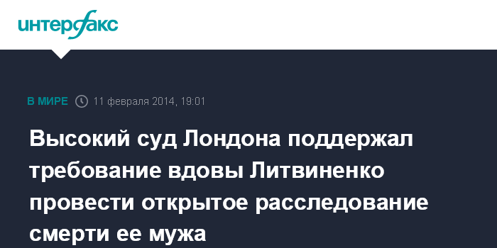 Лондон. 11 февраля. INTERFAX.RU - Высокий суд Лондона удовлетворил ходатайство вдовы бывшего сотрудника ФСБ Александра Литвиненко Марины об отмене решения британских властей, предусматривающего запрет на проведение открытого расследования обстоятельств смерти ее мужа.