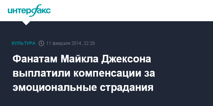 Москва. 11 февраля. INTERFAX.RU - Пятеро поклонников американского певца Майкла Джексона по решению французского суда получили компенсации в размере одного евро за "эмоциональный ущерб", причиненный им смертью певца, сообщает BBC.
