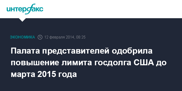 Вашингтон. 12 февраля. INTERFAX.RU - Палата представителей Конгресса США одобрила законопроект о повышении лимита госдолга США до марта 2015 года, после того как республиканцы, вопреки сложившейся практике, отказались от увязки этого решения с другими бюджетными мерами.