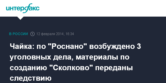 "Что касается "Сколково", более четырех материалов направлено в следственные органы для принятия процессуального решения", - сказал он. Чайка также отметил, что по материалам прокуратуры возбуждено три уголовных дела относительно Роснано.