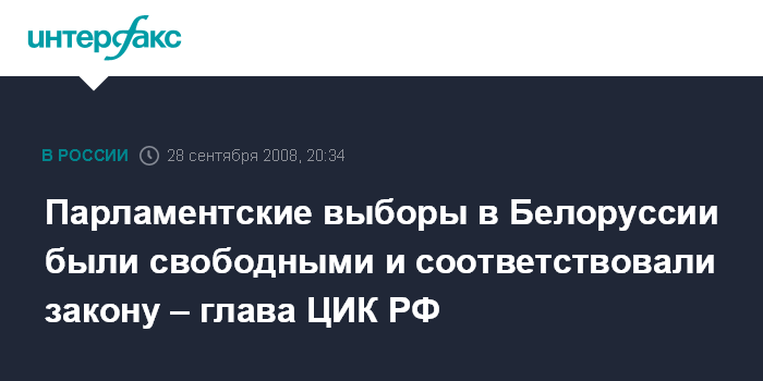 Минск. 28 сентября. ИНТЕРФАКС-ЗАПАД - Председатель Центризбиркома России Владимир Чуров заявляет о соответствии проходящих в Белоруссии парламентских выборов избирательному законодательству страны.