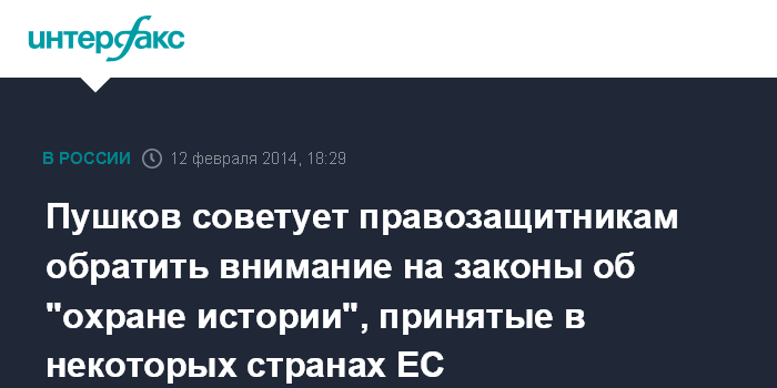 "У меня реакция уполномоченного по правам человека вызывает определенное удивление, потому что всем прекрасно известно, что в ряде европейских стран, считающихся демократическими, существуют законы, запрещающие отрицать то, что в этих странах называют историческими фактами", - заявил Пушков.