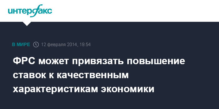 Москва. 12 февраля. INTERFAX.RU - Федеральная резервная система (ФРС) может привязать повышение базовых процентных ставок к определенным качественным характеристикам состояния экономики, отказавшись от целевого уровня безработицы в 6,5%, заявил глава Федерального резервного банка (ФРБ) Сент-Луиса Джеймс Баллард, слова которого передает агентство Bloomberg.
