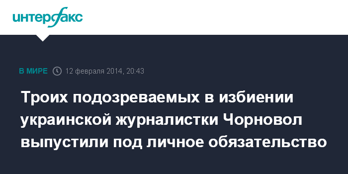 Москва. 12 февраля. INTERFAX.RU - Печерский райсуд Киева выпустил под личное обязательство троих подозреваемых в избиении журналистки и активистки Татьяны Чорновол.