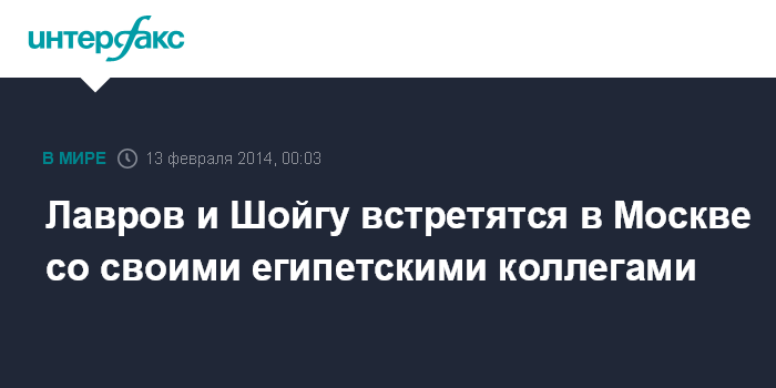 "13 февраля состоится встреча министра иностранных дел РФ Сергея Лаврова, министра обороны РФ Сергея Шойгу и министра иностранных дел Египта Набиля Фахми, министра обороны Египта Абделя Фатаха ас-Сиси", - сказали ранее "Интерфаксу" в МИД РФ.