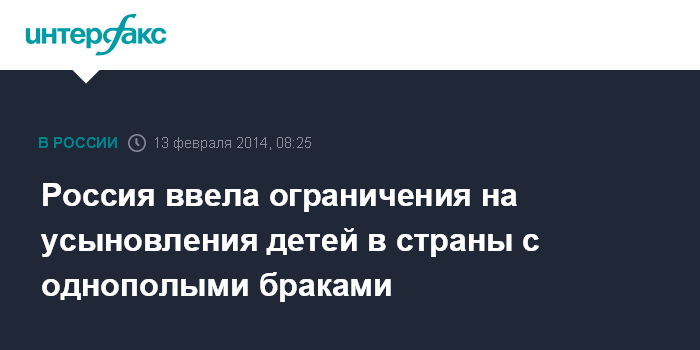 Москва. 13 февраля. INTERFAX.RU - Премьер РФ Дмитрий Медведев подписал постановление об ограничении усыновления детей в страны с однополыми браками.
