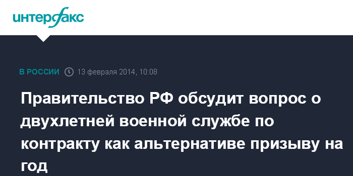 Москва. 13 февраля. INTERFAX.RU - Правительство РФ собирается предоставить гражданам право выбирать проходить ли им военную службу один год по призыву или два года по контракту.