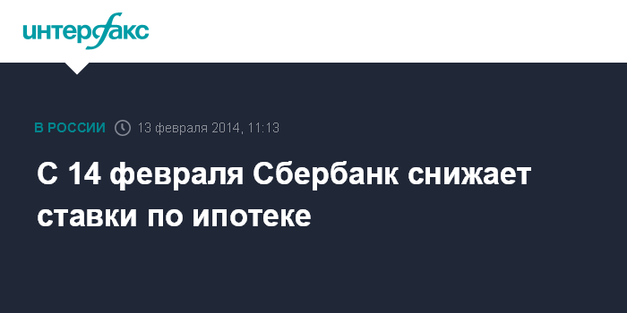 Москва. 13 февраля. INTERFAX.RU - Сбербанк с 14 февраля снижает процентные ставки на все свои популярные продукты ипотечного кредитования: "Приобретение готового жилья", "Приобретение строящегося жилья", "Строительство жилого дома", "Гараж", "Ипотека плюс материнский капитал", "Загородная недвижимость" и "Рефинансирование жилищных кредитов", говорится в пресс-релизе банка.