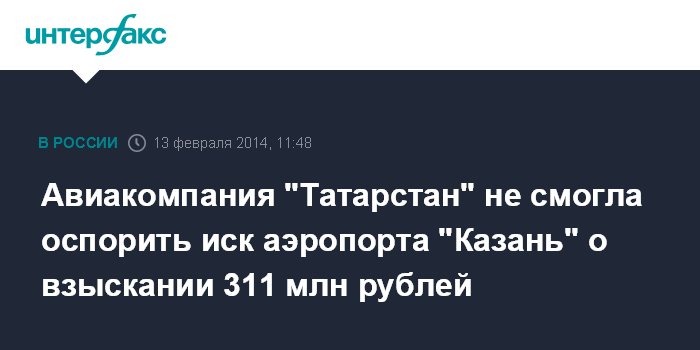 Казань. 13 февраля. INTERFAX.RU - Одиннадцатый апелляционный суд оставил без изменений решение Арбитражного суда Татарстана, постановившего взыскать с ОАО "Авиакомпания "Татарстан" в пользу ОАО "Международный аэропорт "Казань" 311,4 млн рублей, говорится в материалах суда.