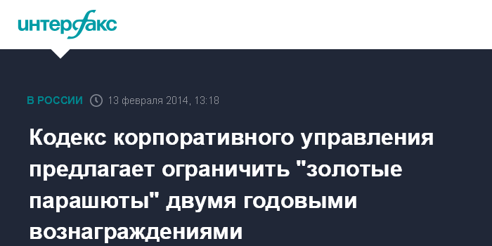 Москва. 13 февраля. INTERFAX.RU - Кодекс корпоративного управления предлагает ограничить объем так называемых золотых парашютов, которые могут выплачиваться топ-менеджменту компаний при увольнении, двумя годовыми вознаграждениями, заявила председатель Банка России Эльвира Набиуллина, представляя кодекс на заседании правительства в четверг.
