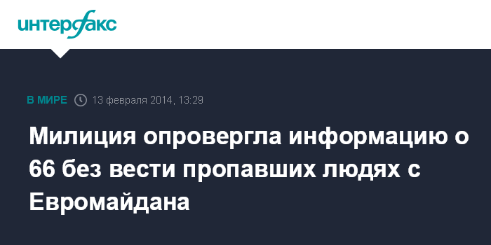 Киев. 13 февраля. INTERFAX.RU - В МВД Украины называют не соответствующей действительности информацию о якобы пропавших без вести активистах на Евромайдане с января 2014 года.