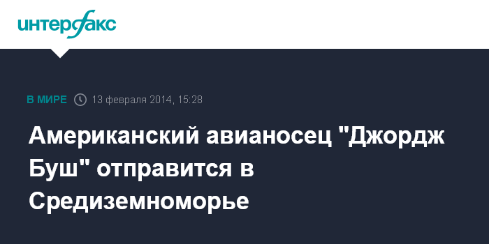 Вашингтон. 13 февраля. INTERFAX.RU - Американская авианосная ударная группа, возглавляемая атомным авианосцем "Джордж Буш", в субботу выйдет из базы в Норфолке (штат Вирджиния) и направится на боевое дежурство на Ближний Восток, сообщило командование сил флота США.