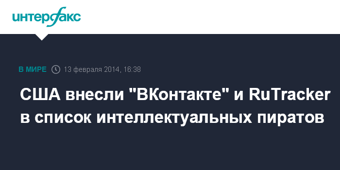 Вашингтон. 13 февраля. INTERFAX.RU - Российская социальная сеть "ВКонтакте" и торрент-трекер RuTracker.org были включены в список нарушителей прав интеллектуальной собственности, составленный торговым представителем США.