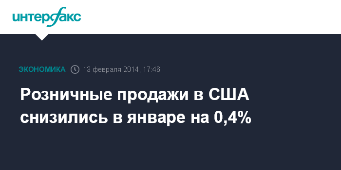 13 февраля. FINMARKET.RU - Розничные продажи в США в январе 2014 года снизились на 0,4% по сравнению с предыдущим месяцем, свидетельствуют данные министерства торговли страны.