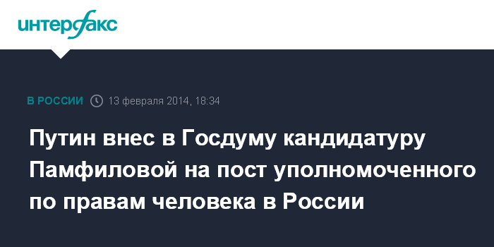 Москва. 13 февраля. INTERFAX.RU - Президент России Владимир Путин в соответствии с федеральным конституционным законом "Об Уполномоченном по правам человека в Российской Федерации" внес в Государственную Думу предложение о назначении Эллы Памфиловой на должность уполномоченного по правам человека в РФ, сообщила в четверг пресс-служба главы государства.
