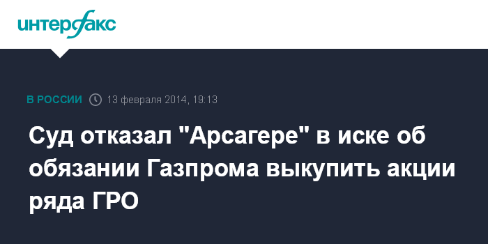 Москва. 13 февраля. INTERFAX.RU - Арбитражный суд Москвы в четверг отказал управляющей компании (УК) "Арсагера" в иске об обязании "Газпрома" исполнить обязанность в течение 35 дней направить публичную оферту всем владельцам голосующих акций ОАО "Ростовоблгаз", ОАО "Калугаоблгаз", "ОАО "Нижегородоблгаз" и ОАО "Тамбовоблгаз" и выкупить эти акции, сообщил корреспондент "Интерфакса" из суда