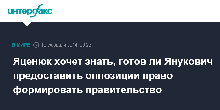 Об этом заявил лидер фракции "Батькивщина" Арсений Яценюк на пресс-конференции в четверг в Киеве. Отвечая на вопрос, на каких условиях он готов возглавить правительство, Яценюк сказал: "Я обращаюсь сейчас публично к Виктору Януковичу, чтобы президент Украины дал свои ответы: готовы ли вы восстановить баланс власти в стране, готовы ли вы к тому, что оппозиция формирует оппозиционное правительство Майдана, правительство народного доверия, готовы ли вы к тому, что оппозиция, новое правительство предоставит четкую программу действий и эта программа действий будет поддержана всем составом парламента?… Мы ожидаем публичного ответа президента".